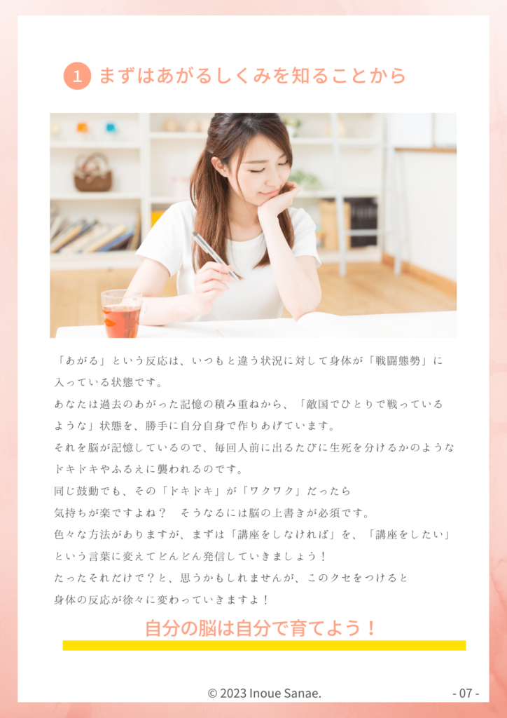 「まずはあがるしくみをしることから」「最初の5分がカギ!」「テキスト作りのコツ」など、今すぐマネできる5個のテクニックをご紹介。